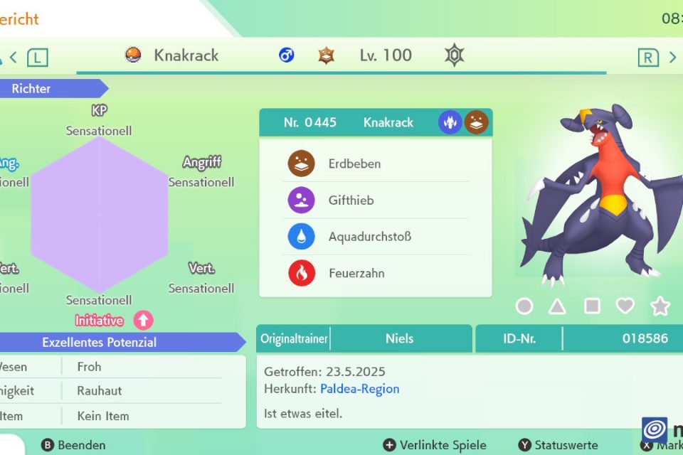 Wie Anfang der Woche angekündigt, startete gestern Nacht das neueste 7-Sterne-Tera-Raid-Event in Pokémon Karmesin und Pokémon Purpur. Euer Gegner ist dieses Mal das Sinnoh-Pokémon Knakrack, unter anderem bekannt als der treue Partner des Pokémon-Champs Cynthia. Es ist auf Level 100, hat den Tera-Typ Boden und beherrscht nach dem Fangen die Attacken Erdbeben, Gifthieb, Aquadurchstoß und Feuerzahn. Es hat perfekte IV-Werte in jeder Kategorie und die Versteckte Fähigkeit Rauhaut. Pro Spielstand lässt es sich nur einmal fangen. Das Tera-Raid-Event mit dem Rasanz-Pokémon endet am 25. Mai 2025 um 01:59 Uhr. Das Ganze wird vom 30. Mai bis 1. Juni wiederholt, dann tauchen auch vermehrt Heiteira in Raids auf.
