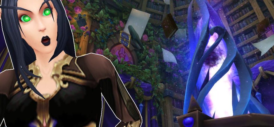 Richtig beeindruckend wird es aber erst, wenn man den Blick nach oben lenkt. Denn dann sieht man, dass die Bibliothek noch über mehrere Stockwerke geht und sich regelrecht der Unendlichkeit entgegen neigt. Mehrere Gegenstände schweben in der Luft und scheinen von einem Leerenportal an der Decke angezogen zu werden. Das erinnerte mich ein wenig an Karazhan oder auch den Inschriftenkundler-Laden in Dalaran – aber bisher habe ich das noch nirgendwo so stimmig umgesetzt gesehen.