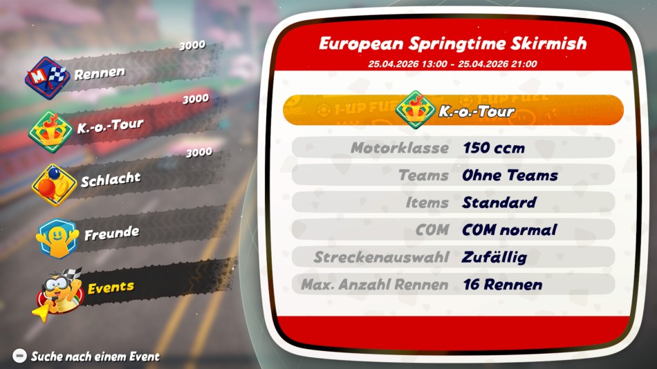 Für das kommende Wochenende könnt ihr wieder die Motoren vorheizen, denn Samstag, der 25. April, steht ganz im Zeichen von Mario Kart World. Von 13:00 bis 21:00 Uhr habt ihr die Möglichkeit, am European Springtime Skirmish teilzunehmen. Dabei handelt es sich um ein Online-Event, bei dem ausschließlich K.o.-Tour-Rennen absolviert werden können.